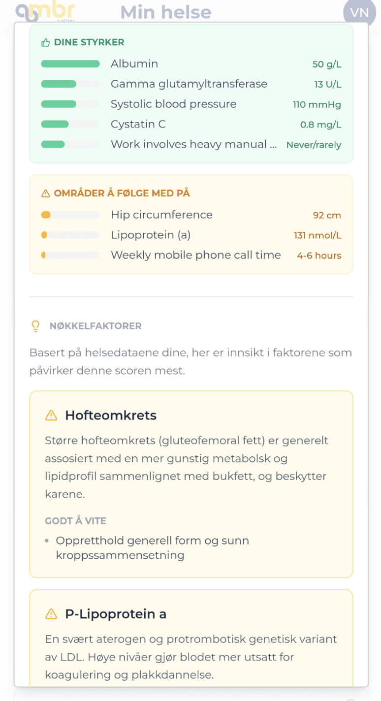 Ambr analyserer dataene dine, kryssrefererer medisinsk forskning og lager en personalisert helsemodell som kartlegger helseretningen din 10–20 år frem.